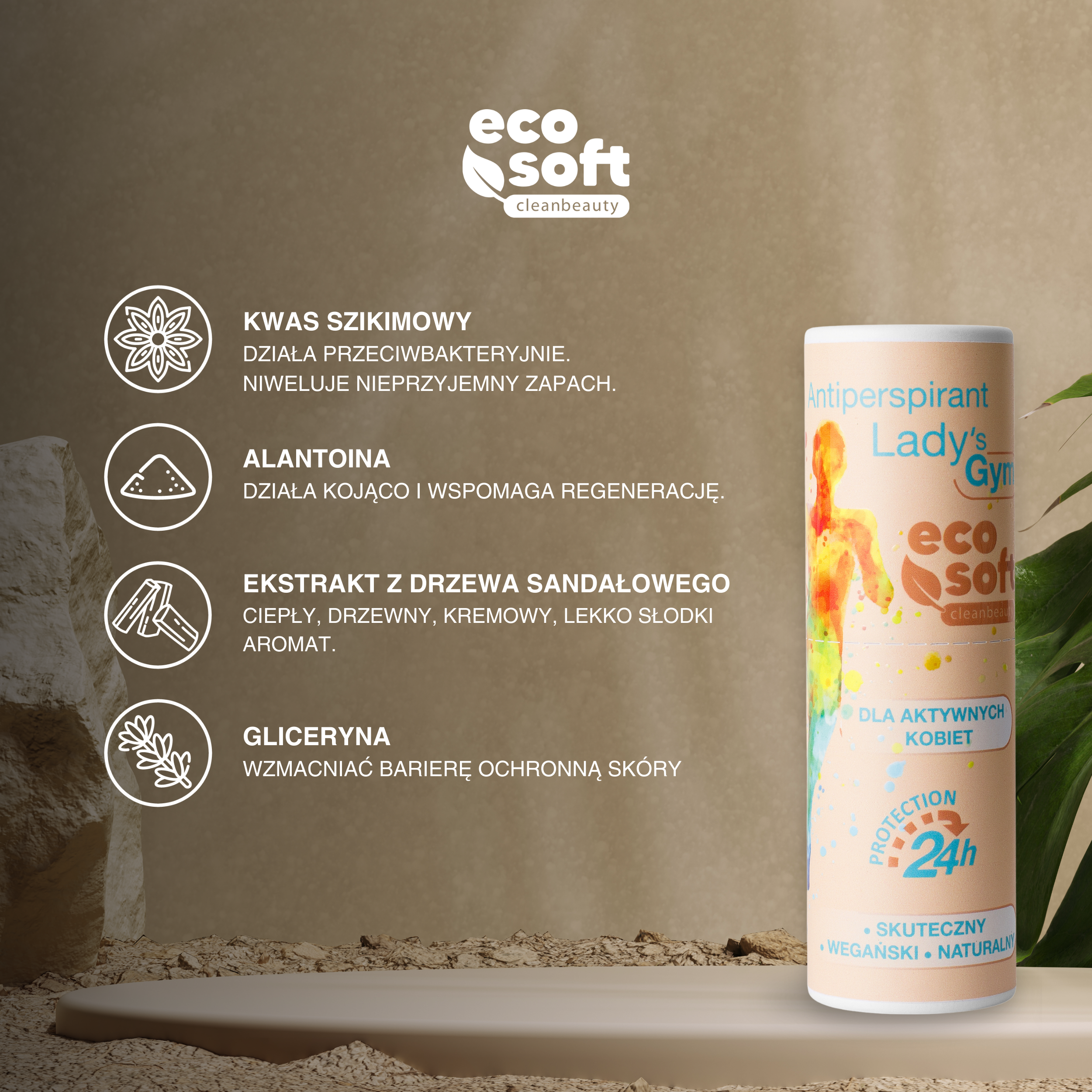 ECOSOFT Lady’s Gym łączy innowacyjną, pielęgnującą formułę z wysoką skutecznością. Ekstrakt z drzewa sandałowego, kwas szikimowy z gwiazdek anyżu oraz alantoina pomagają utrzymać skórę pod pachami gładką, zadbaną i komfortową, nawet podczas najbardziej intensywnego dnia.