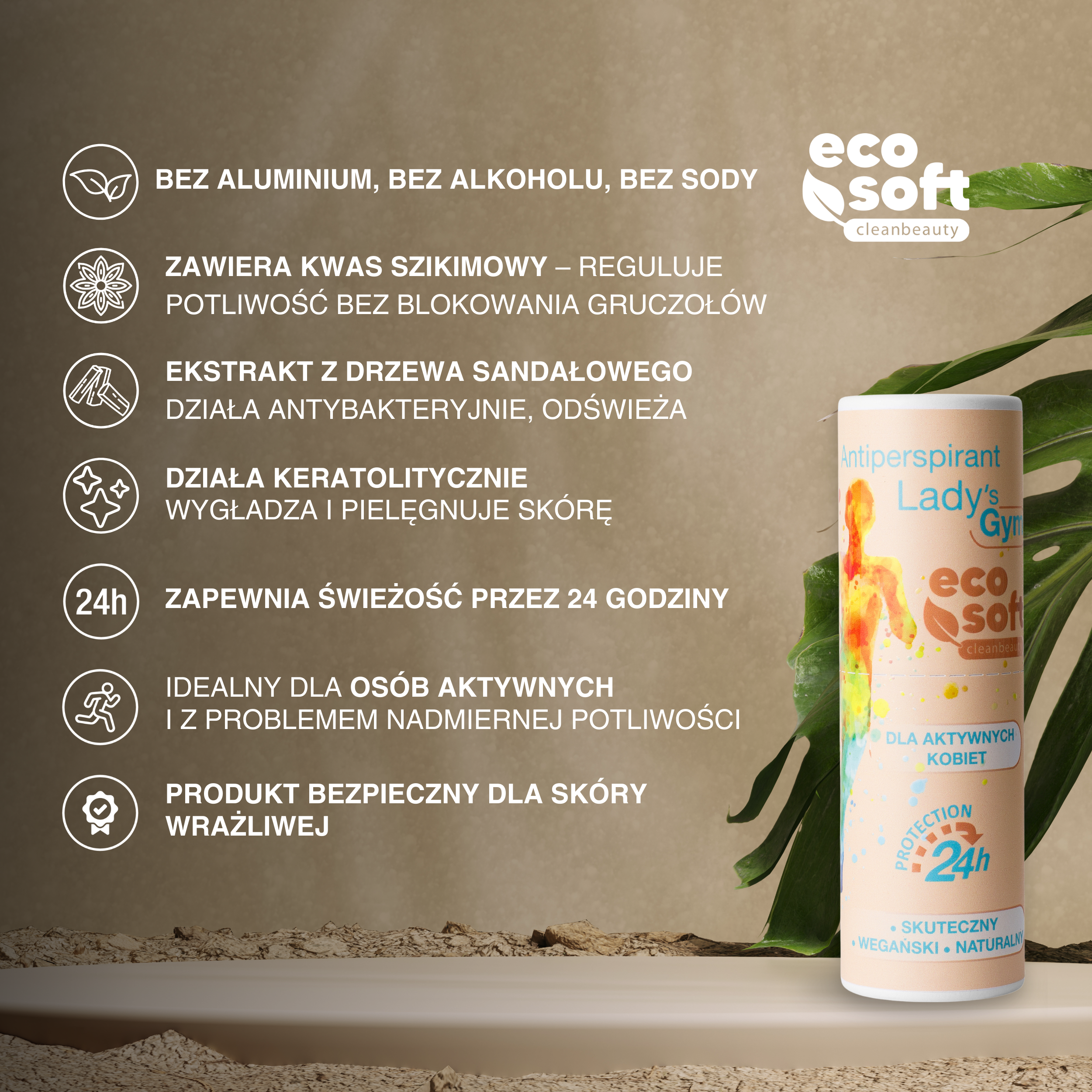 Lubisz być w ciągłym ruchu – na siłowni, w pracy, na spacerze czy w drodze między spotkaniami? ECOSOFT Lady’s Gym to wegański, naturalny antyperspirant w sztyfcie, stworzony specjalnie dla aktywnych kobiet. Zapewnia nawet do 24 godzin ochrony przed potem i nieprzyjemnym zapachem, a jednocześnie jest delikatny dla skóry – bez alkoholu i soli aluminium.